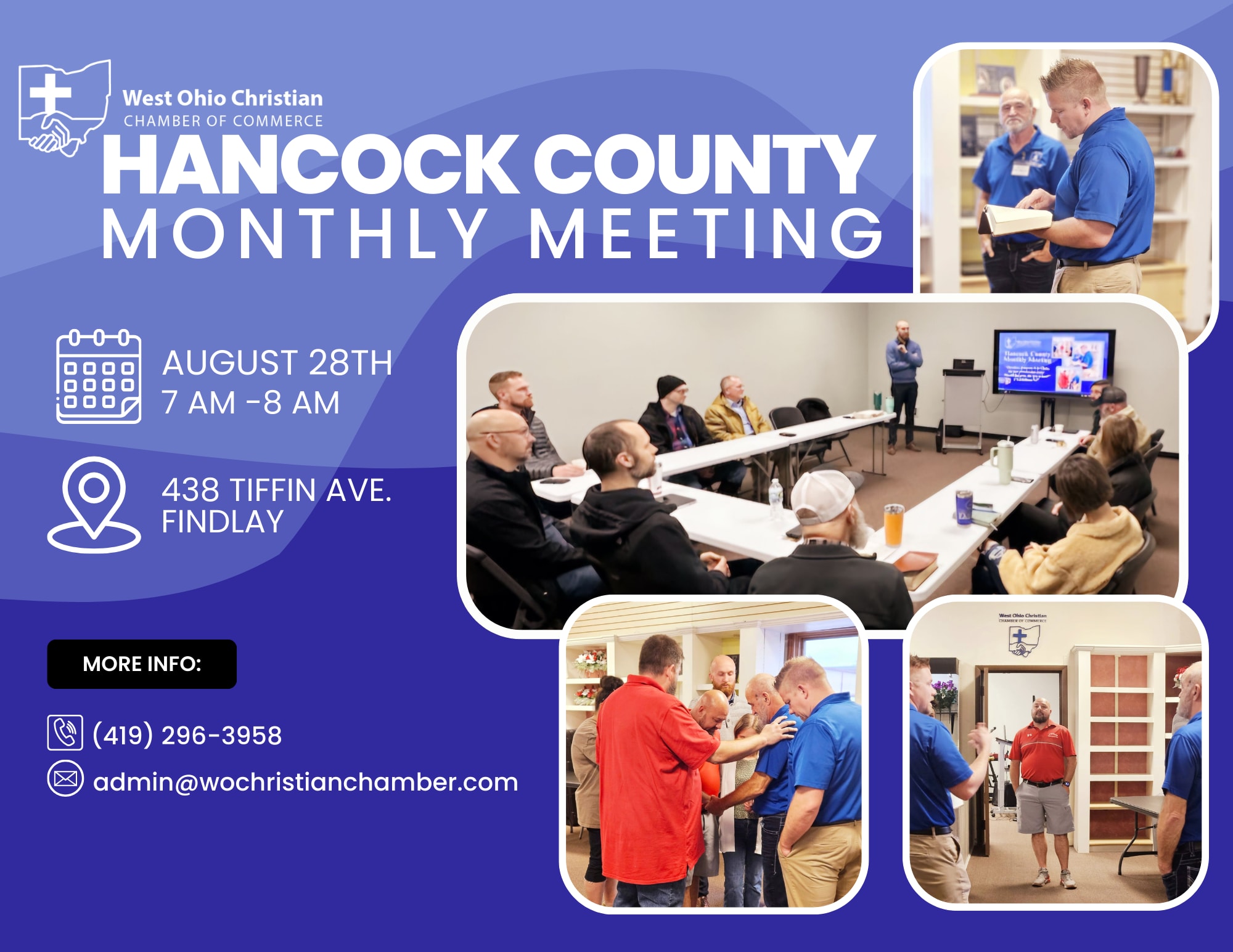 The West Ohio Christian Chamber Hancock County monthly meeting will be held on August 28th, 7:00am, at the Hancock County WOCC Office located at 438 Tiffin Avenue, Findlay, Ohio. Not a member? Not a problem! All are invited to attend one meeting free of charge to see how God is working in our communities. The meetings will last one hour and consist of information on new businesses to the Chamber and feature a guest speaker, with a half hour of networking and fellowship to follow. As a member of the West Ohio Christian Chamber if you would like to sponsor a monthly meeting, please contact the Chamber office by phone at 419-296-3958 or by email at admin@wochristianchamber.com and speak with Mollie who will be more than happy to give you all the details. She will also be happy to answer any questions about the Chamber anyone may have.