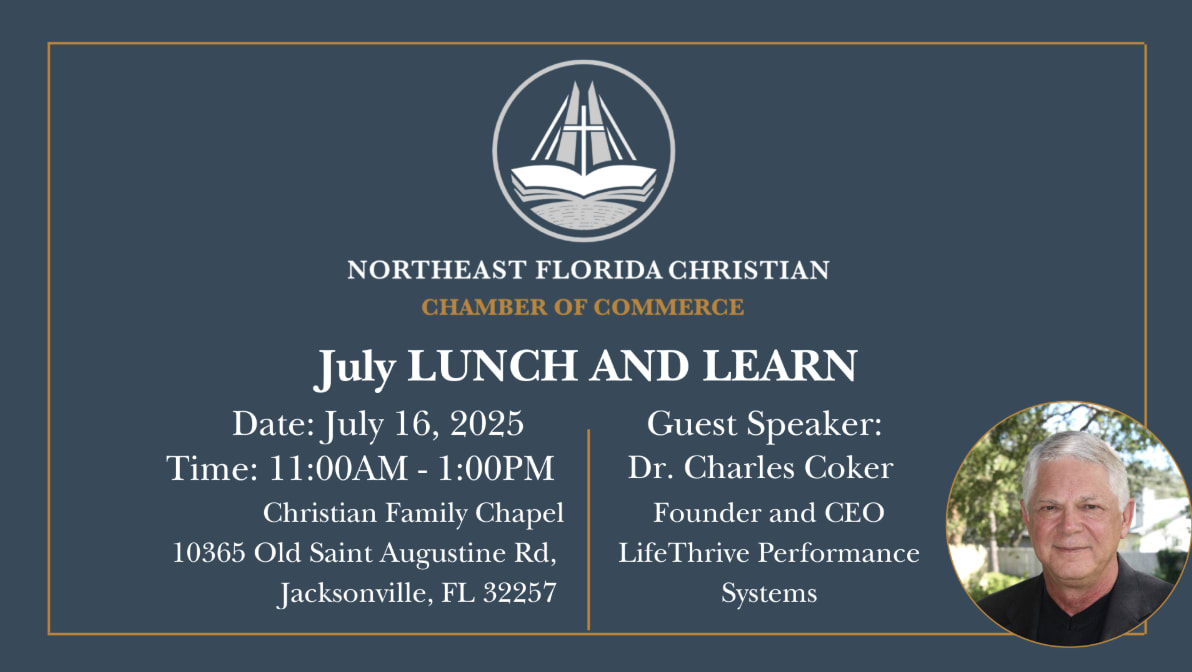 Join the Northeast Florida Christian Chamber for our July Networking Lunch & Learn with guest speaker Dr. Charles Coker Founder and CEO of LifeThrive Performance Systems. Our "Lunch and Learn" events are designed to help you build meaningful connections, gain valuable insights, and grow both personally and professionally.