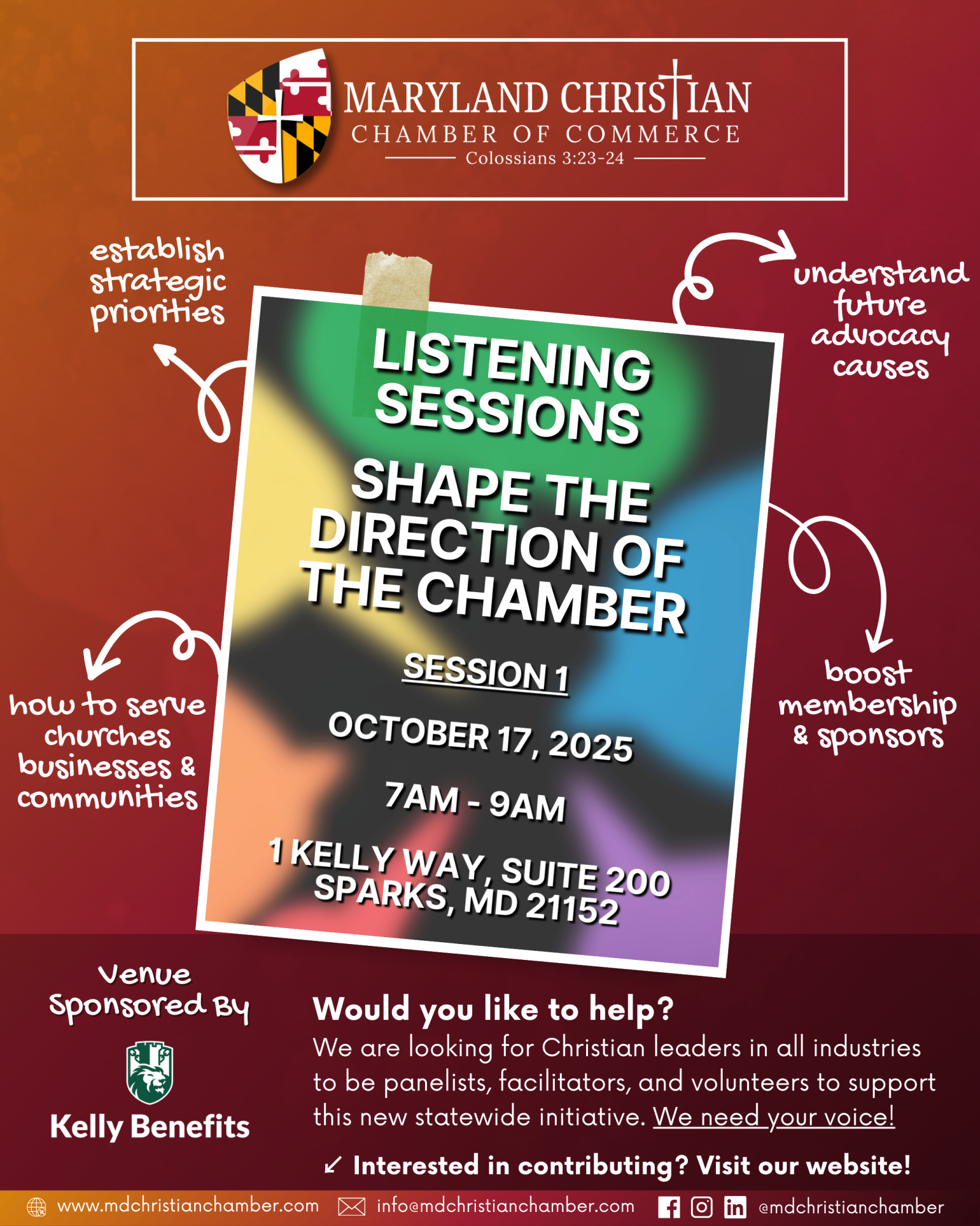 Join the Maryland Christian Chamber of Commerce for one of our Listening Sessions. This is a collaborative gathering of Christian business leaders, pastors, and community partners. These sessions are designed to be interactive and solution-focused as we roll up our sleeves, share ideas and challenges, and create measurable action steps that will: Strengthen our communities - Serve God through our work - Support and grow Christian-owned businesses. Your voice matters. Together, we can shape the future of Christian business in Maryland. Doors open at 6:30am (est)