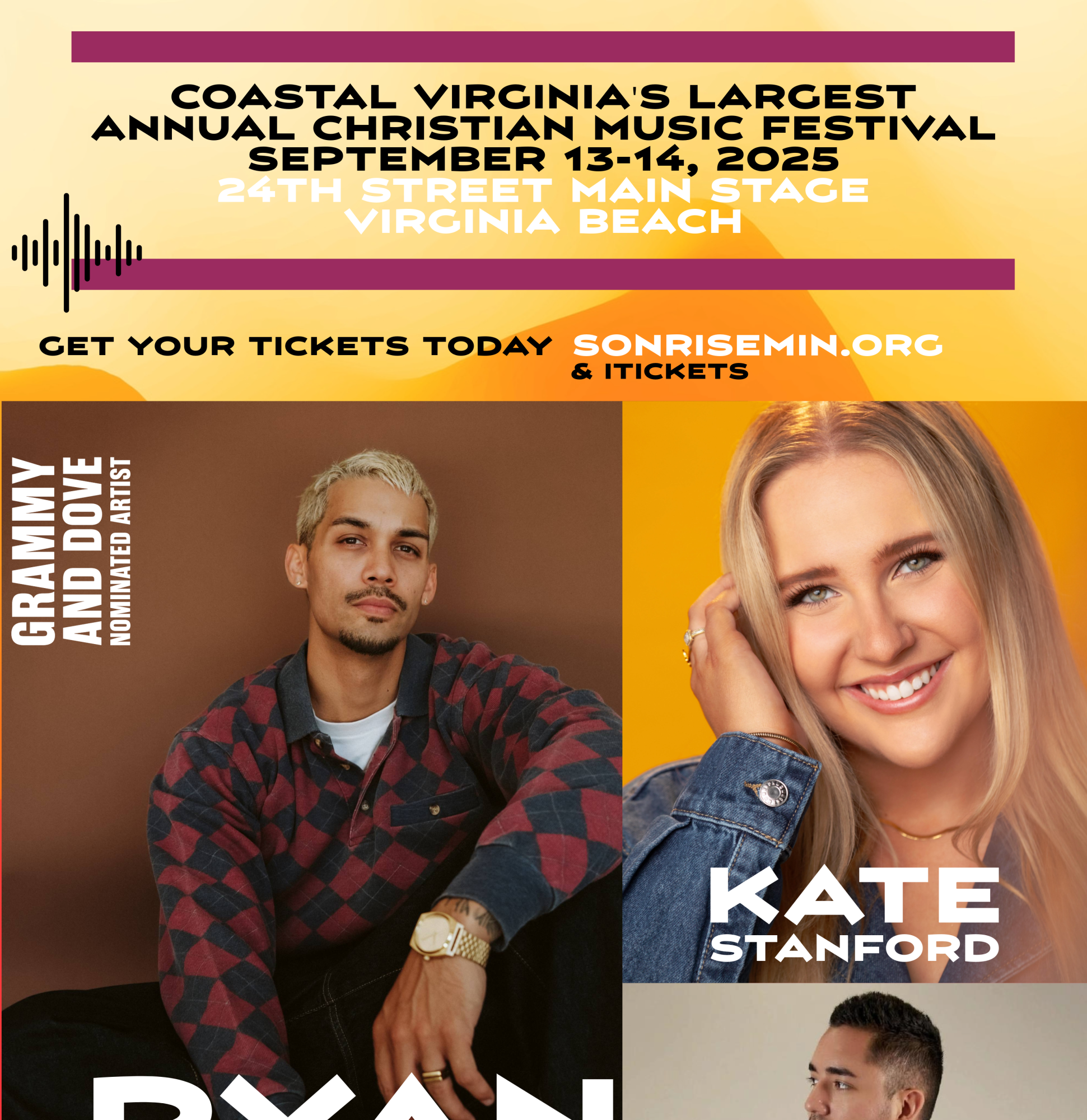Virginia Beach- The SonRise Music Festival, one of Coastal Virginia's largest Christian music festivals, is set to return to the beautiful Virginia Beach Oceanfront this Fall. The annual family-friendly festival (est in 2014) will take place September 12th & 13th. The SonRise Music Festival will present Grammy and Dove nominated Ryan Ellis as well as Kate Stanford. Special Guest Speaker: Sean Rodriguez, Emcee: Shannon Kendrick. Also Featuring local artists Michelle Littman & Our Heart of Worship Ministries, Rapper Ken Williams and more. The weekend includes uplifting worship, relevant and impactful speakers. SonRise is an outreach designed to connect people of all ages and social backgrounds for a weekend filled with music, kids activities, volleyball on the sand and much more. There will also be a variety of themed tents and vendors for festival attendees to explore/shop/browse. For more info visit: www.sonrisemin.org Location and venue address: 24th Street Park Virginia Beach at the oceanfront.