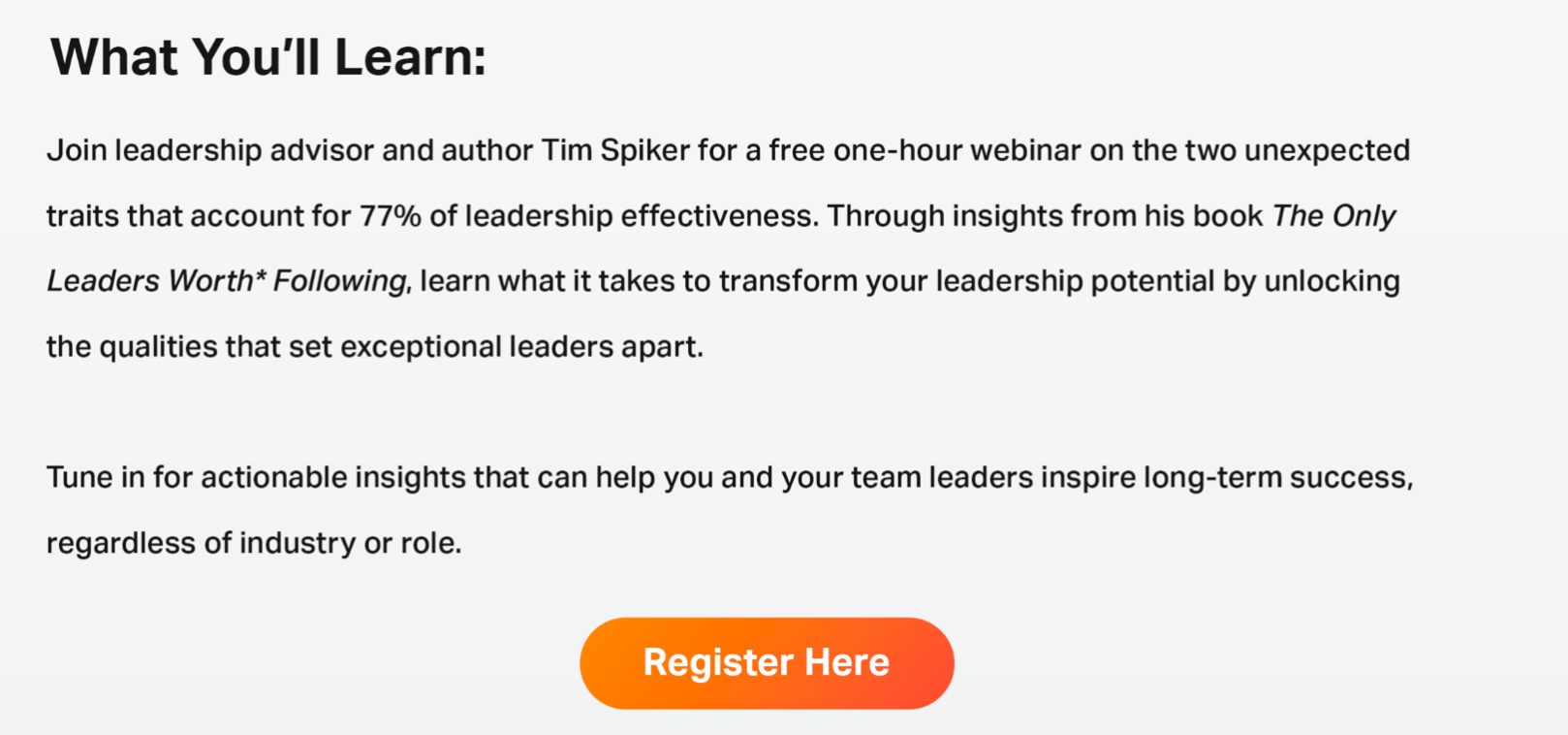 Join leadership advisor and author Tim Spiker for a free one-hour webinar on the two unexpected traits that account for 77% of leadership effectiveness. Through insights from his book The Only Leaders Worth* Following, learn what it takes to transform your leadership potential by unlocking the qualities that set exceptional leaders apart.