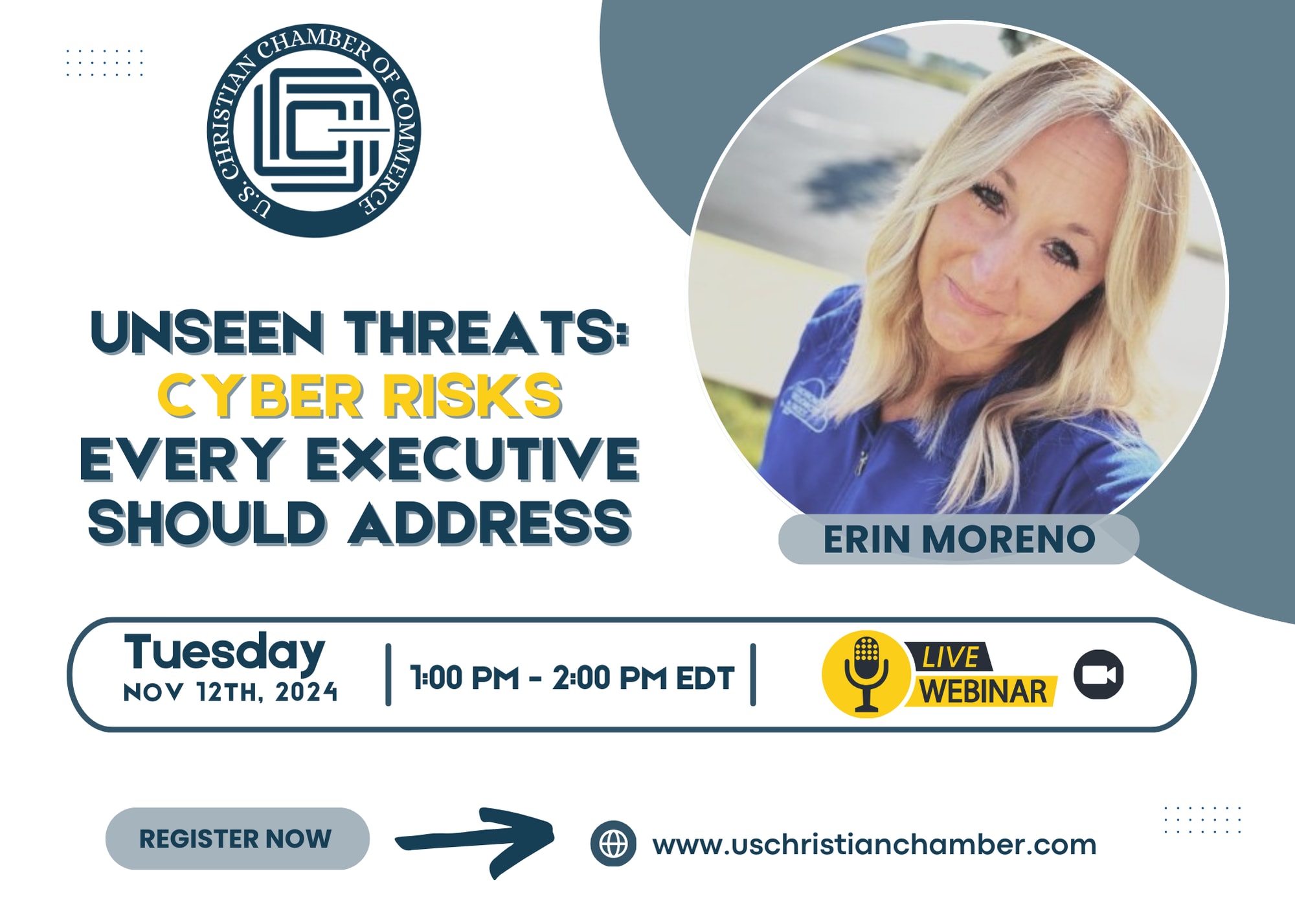 Zoom Live Webinar Join us on November 12th, 1:00 pm - 2:00 pm EST as Erin Moreno discusses cyber risks every executive should address.