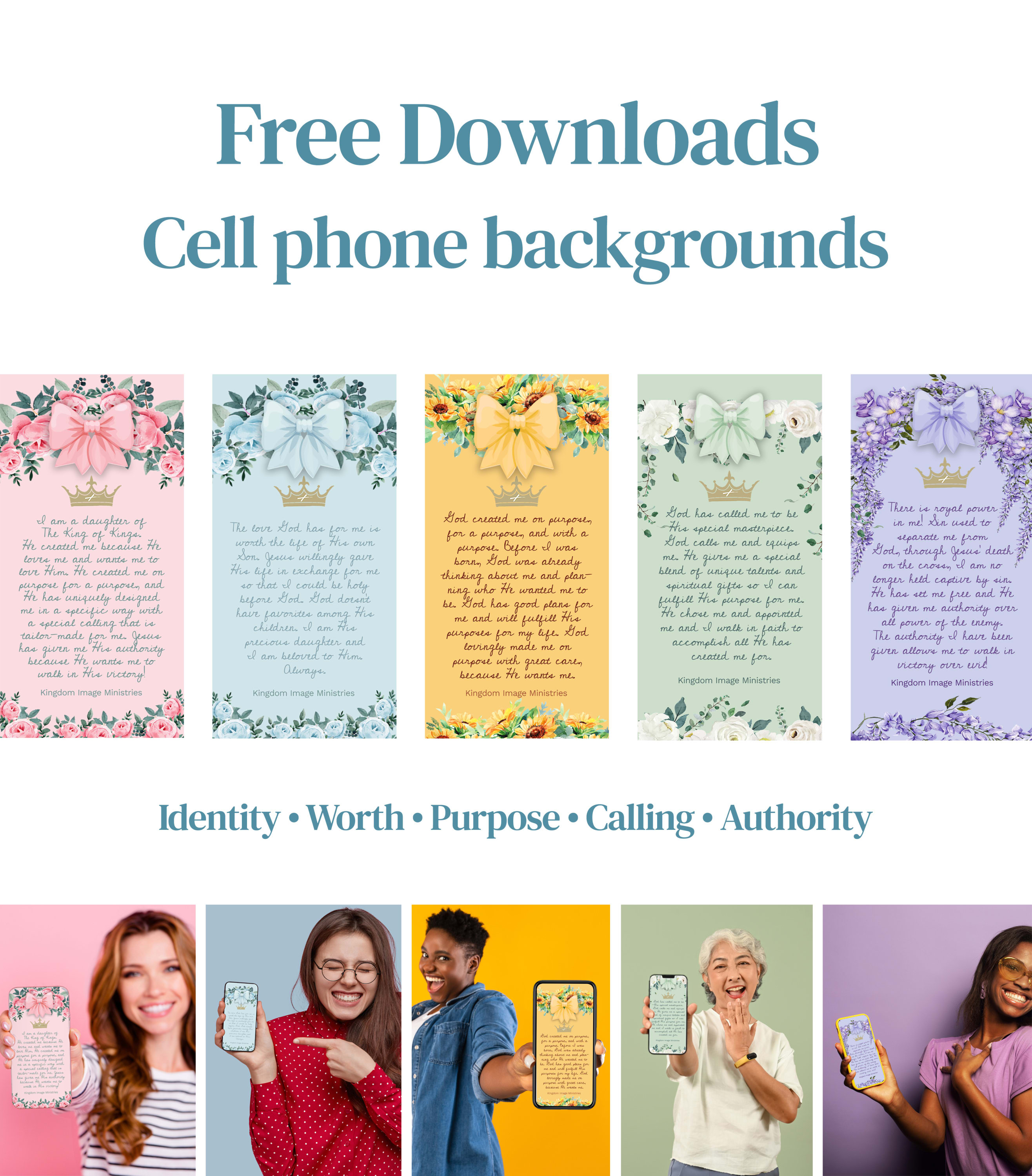 Are you wanting to positively impact younger generations who are looking to you for support in their faith journey, but feel as though you need strength to stand in assurance yourself first before you can truly help them? Imagine becoming stronger in your Christian faith alongside your daughters, their grandmas, aunts, and friends...together. Kingdom Image Ministries will help you grow in your identity, worth, purpose, calling, and authority in Jesus Christ so that you can confidently lead the children in your life from a place of spiritual excellence and help them live out their Christian faith! Download these 5 free cell phone backgrounds/wallpapers as a free gift to you, "just because!"--no strings attached!