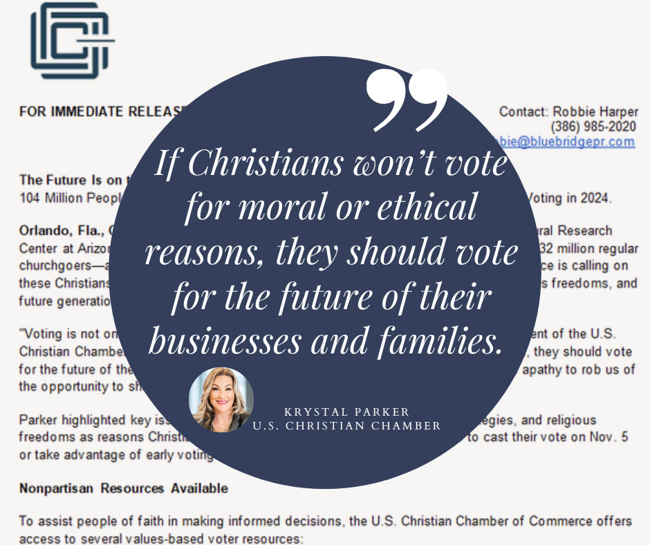 "Voting is not only a civic duty but a biblical responsibility," said Krystal Parker, president of the U.S. Christian Chamber of Commerce. "If Christians won’t vote for moral or ethical reasons, they should vote for the future of their businesses and families. Our silence is costly. We cannot allow apathy to rob us of the opportunity to shape the future."