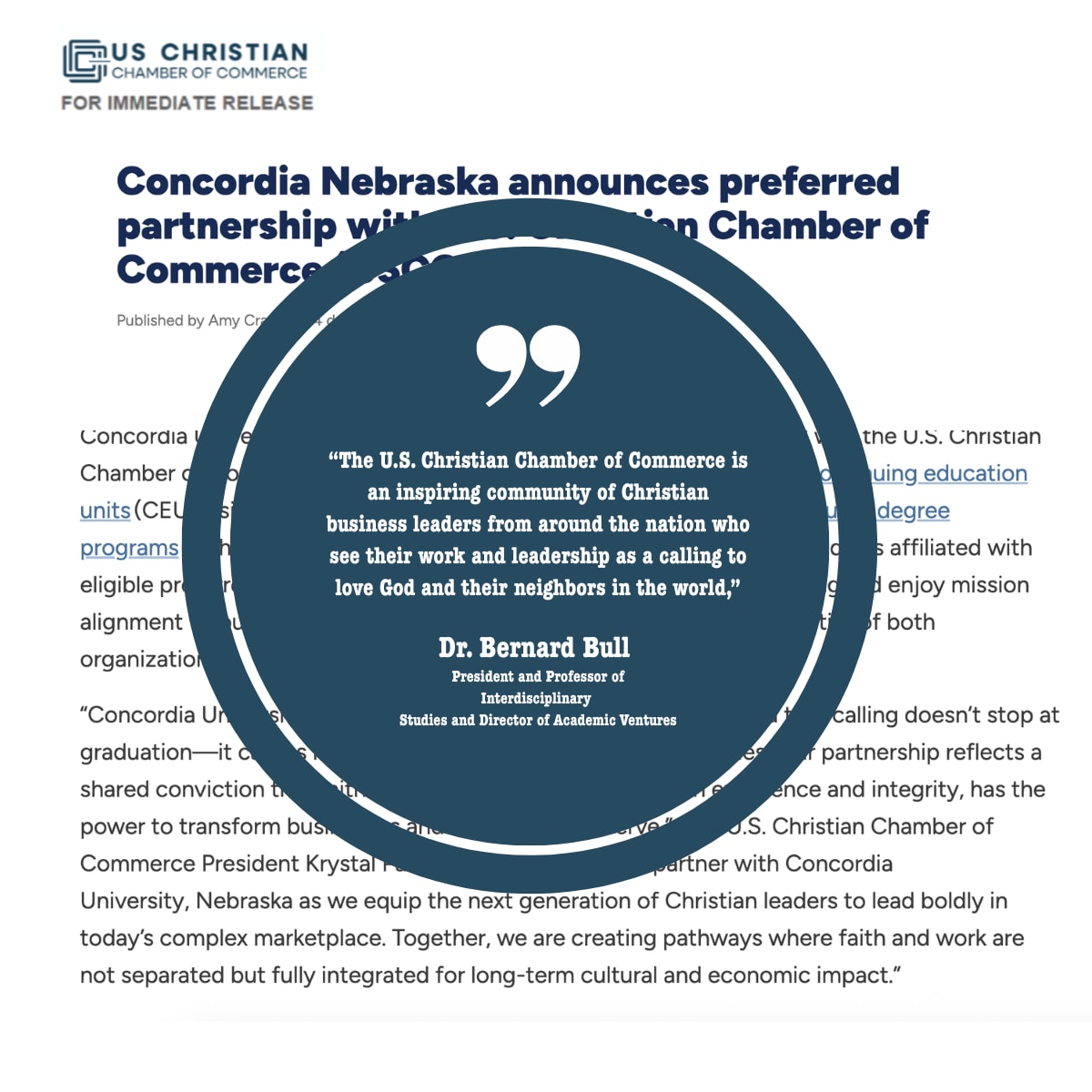 FOR IMMEDIATE RELEASE - Concordia Nebraska announces preferred partnership with U.S. Christian Chamber of Commerce