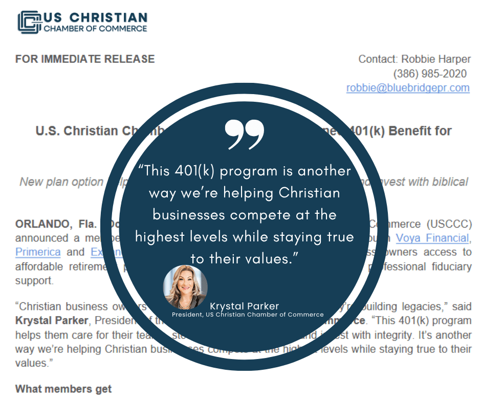 “Christian business owners are not just building companies — they’re building legacies,” said Krystal Parker, President of the U.S. Christian Chamber of Commerce. “This 401(k) program helps them care for their teams, steward resources wisely, and invest with integrity. It’s another way we’re helping Christian businesses compete at the highest levels while staying true to their values.”