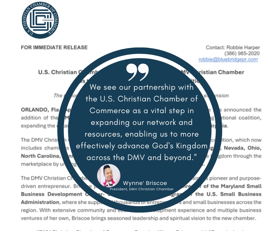 FOR IMMEDIATE RELEASE - U.S. Christian Chamber of Commerce Welcomes DMV Christian Chamber as the 18th Member of the National Coalition